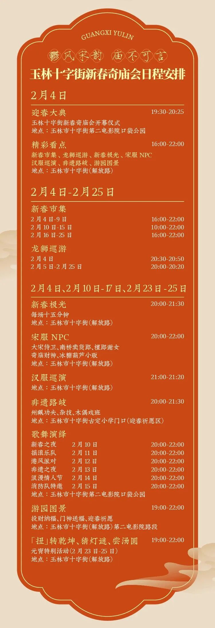 1.龙船里音乐美食广场:每晚均有“龙运当头,食来运转”主题表演。其中:2024年2月10日(正月初一)、2月14日(正月初五)、2月17日(正月初八)、2月24日(元宵节),除正常的表演外,还将进行抽奖活动,最高可获得品牌二轮电动车奖励。 2.好声音金逸影城:推出100元新春双人观影套餐:电影票两张+双人可乐+爆米花一份。